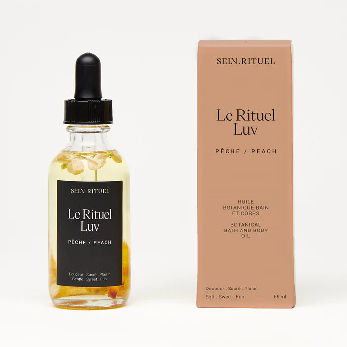 Mélange l'huile avec le sel de bain Poussière Luv pour exfolier ta peau. Lis notre article pour comprendre pourquoi s'exfolier et comment le faire avec nos produits.