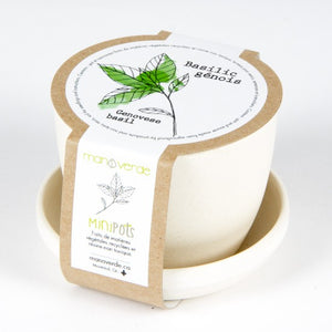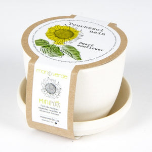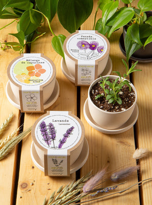 Contenu : contenant (carton compostable ou pots et soucoupe faits de matières recyclées, semences, terreau pour semis et instructions détaillées.