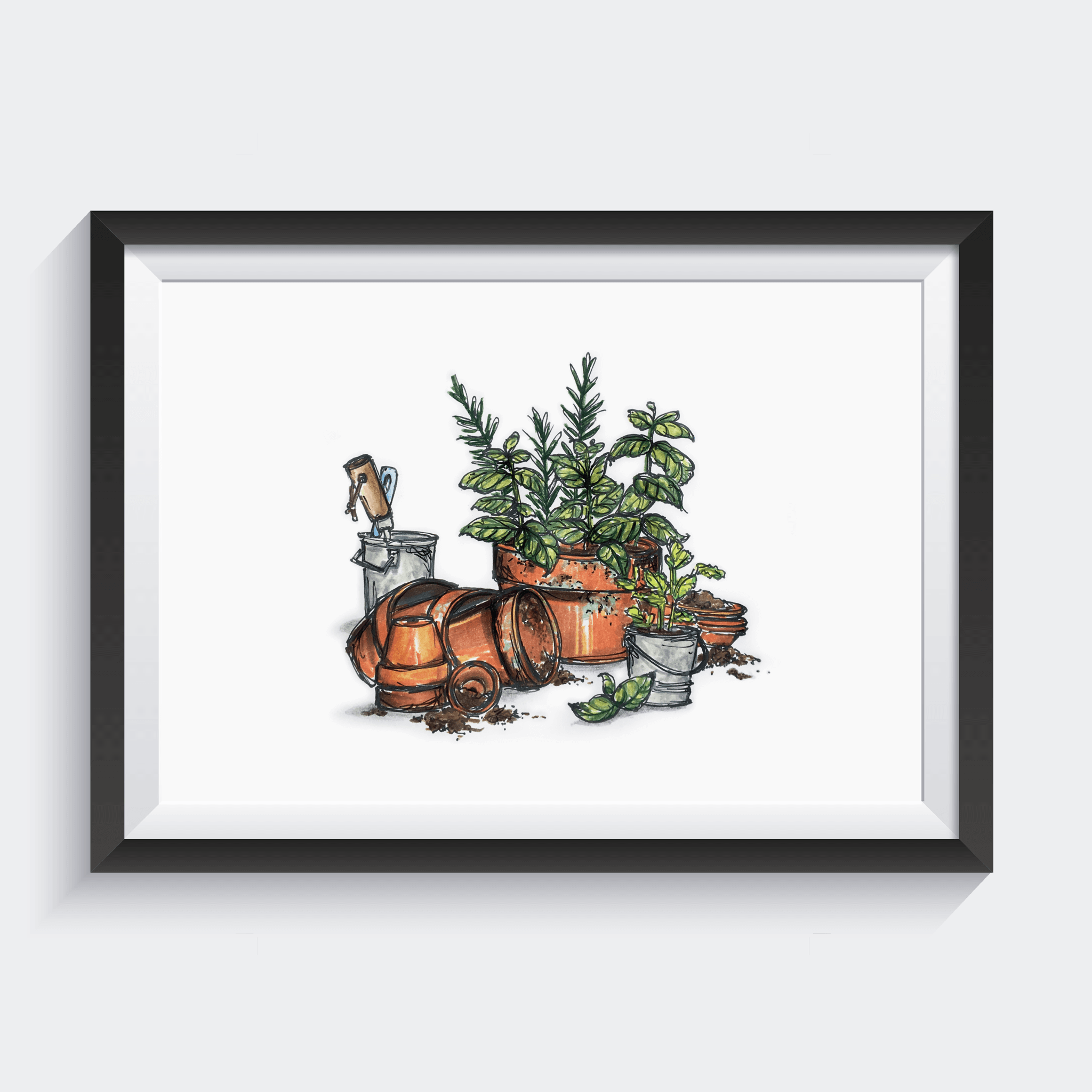 Affiche illustrée à encadrer (format paysage). Basilic en pot, petit jardin. Imprimé sur carton blanc, lisse et mat. Illustration créée à la main, imprimée en petits lots par un imprimeur local.