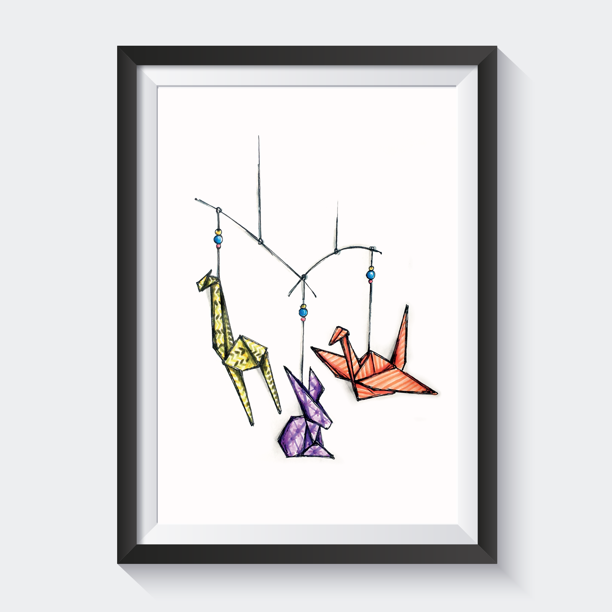 Affiche illustrée à encadrer (format portrait).  Mobile origami. Imprimé sur carton blanc, lisse et mat.