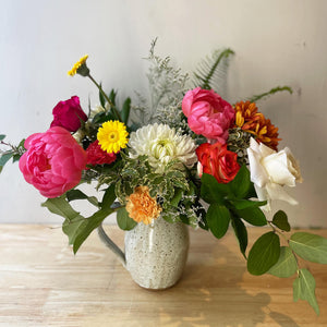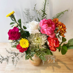 Offert en 4 formats, notre mélange floral 'couleurs chaudes' soigneusement assemblé par notre équipe fleuriste. Principalement composé de roses, marguerites, germini / gerbera, crémone, verdure et pivoines (ou autre fleur de saison si non disponible ). Une coloration ensoleillée avec un heureux mélange de rose, jaune, orangé et /ou rouge avec une délicate touche de blanc.
